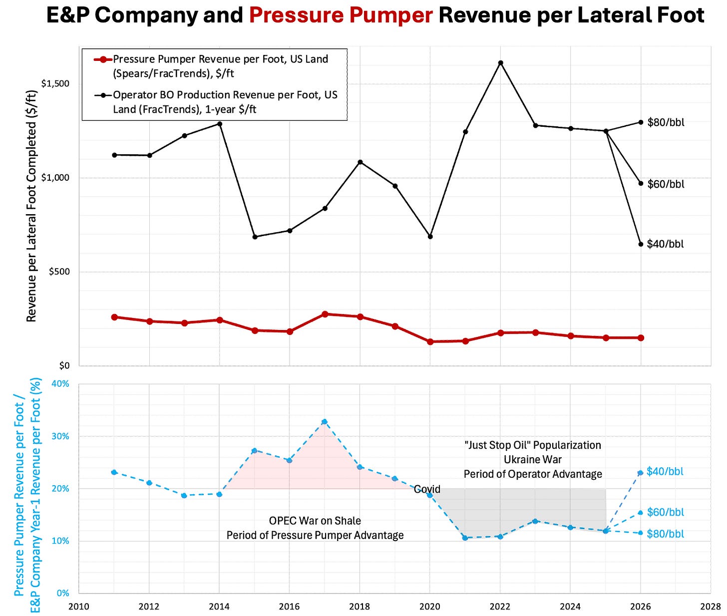 The Pressure-Pumper-to-E&P-Company-Revenue-per-Foot Ratio peaked at about 32% in 2017 and bottomed right after Covid in 2021-2022 at about 10%. That is where it still lurks.
