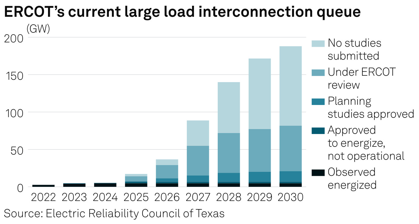 Several speakers highlighted just how great Texas and ERCOT were doing. The graph below shows current requests to connect new large loads to the grid. The 189 GW of generation capacity waiting in line through 2030 is about 2x ERCOT’s current peak demand, with 69% of the additions coming from data centers. Granted, some studies still have to be submitted and some of these will fail. But the number is huge.