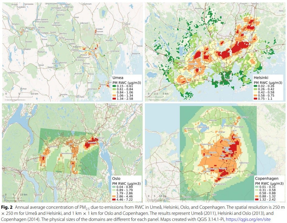 An increasing concentration of PM2.5 (2.5 micron) particles now lurks around Scandinavian cities from industrial-scale plants that can burn wood and from home wood-burning stoves. A recent study shows this can shave months off Scandinavians’ life expectancy: