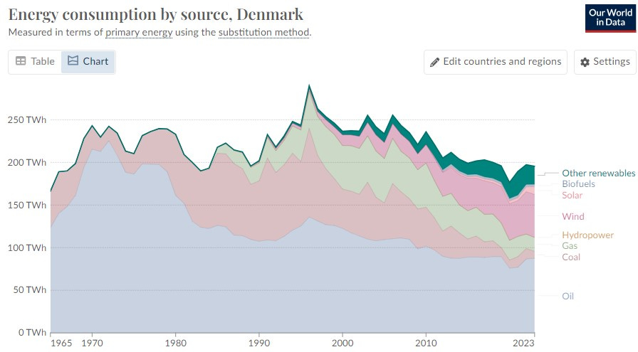 I used a wood-pellet grill for the turkey yesterday. Danes have also gone in that direction. They have dramatically increased their use of wood, straw and waste for electricity and heating needs (https://rgo.dk/en/in-denmark-we-depend-on-braing-to-step-off/), mostly by importing wood from other countries. Bioenergy is now 21% of electricity generation and about 11% of all Danish primary energy use (2022 Denmark Energy Statistics) as per OurWorldInData.org in the graph below.
