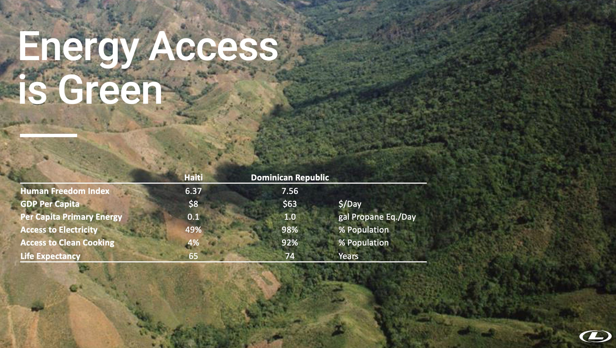 This leads to dramatic differences between the neighbors: Dominicans enjoy longer lives, more money, and more access to electricity, clean cooking and energy. For reference, in the United States, we use about 7 gallons of propane for all of every individual’s primary energy use for every day. In the Dominican Republic that is 1 gal Propane-equivalent per person per day, and in Haiti it is 10x lower.
