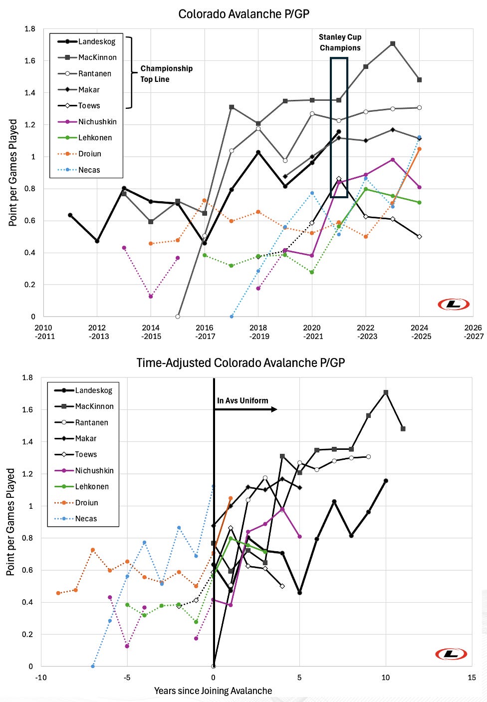 The culture of good leadership and hard work is contagious, and our captain was an example. The Avs trained their replacements to become new leaders, many of whom perform better with the Avs than with their previous teams. This is apparent in the lower graph when you shift player’s stats to their start as an Avalanche.
