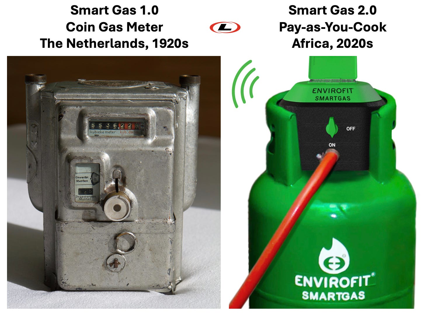 A century later, a similar change is happening in some places around the world, most notably Africa. Today, this innovation is wearing a more modern coat. Envirofit Smartgas 2.0 uses a mobile phone to prepay for gas use. Pay-as-you-Cook lowers the adoption threshold for users by lowering the up-front money they would have to pay for a whole canister of natural gas. People who already use charcoal enjoy this particular benefit already, as users are already on a typical daily purchase for this much dirtier product. Getting LPG on a daily pay schedule levels out this particular benefit of charcoal.