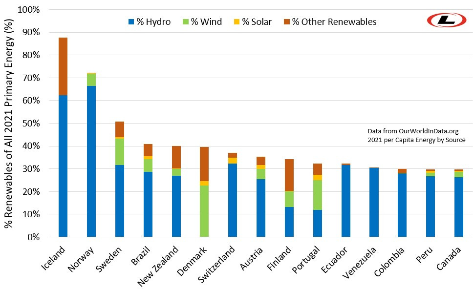 Countries missing from this list, despite huge investments, show the challenges of scaling wind and solar. That’s why you do not see Germany (18% renewables) and China (15% renewables) on the list.
